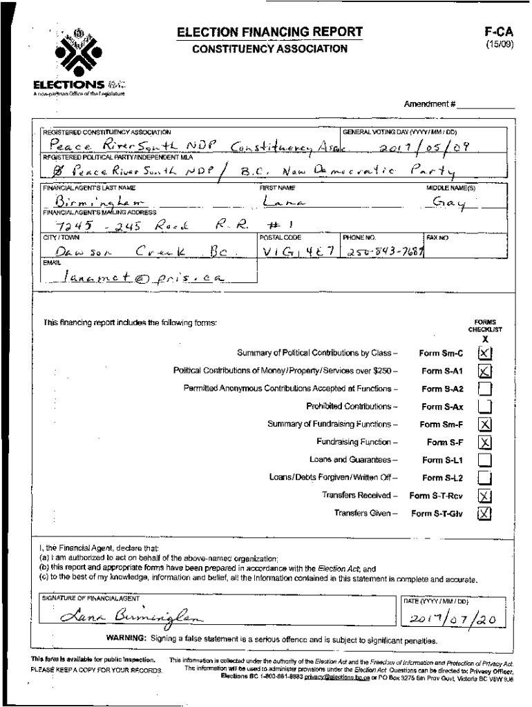 ELECTION FINANCING REPORTFCACONSTITUENCVASSOCIATION(15/09)ELECTIONS A nonpartisan Office of the LegislatureAmendment# _ _ _ _ __REGISTERED CONSTITUENCY Association. CeR,.(., Sc.1\'+LND registered