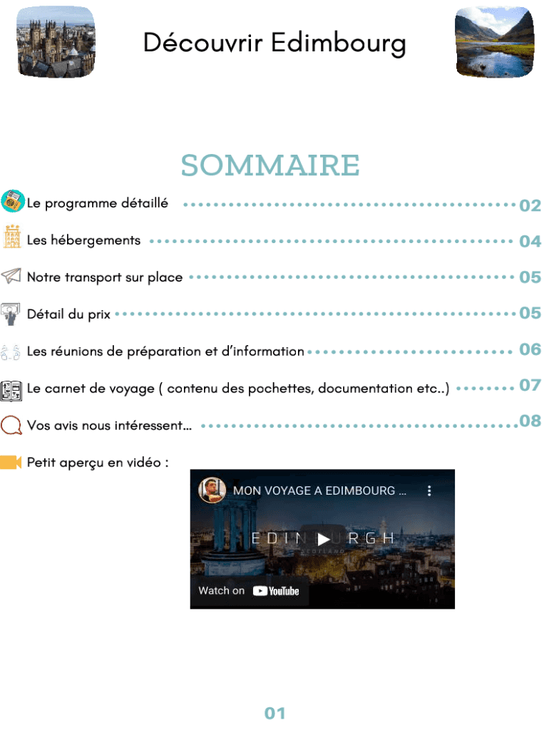 Dcouvrir EdimbourgSOMMAIRE Le programme dtaill02Les hbergements04Notre transport sur place05Dtail du prix05Les runions de prparation et dinformation06Le carnet de voyage ( contenu des pochettes, documentation