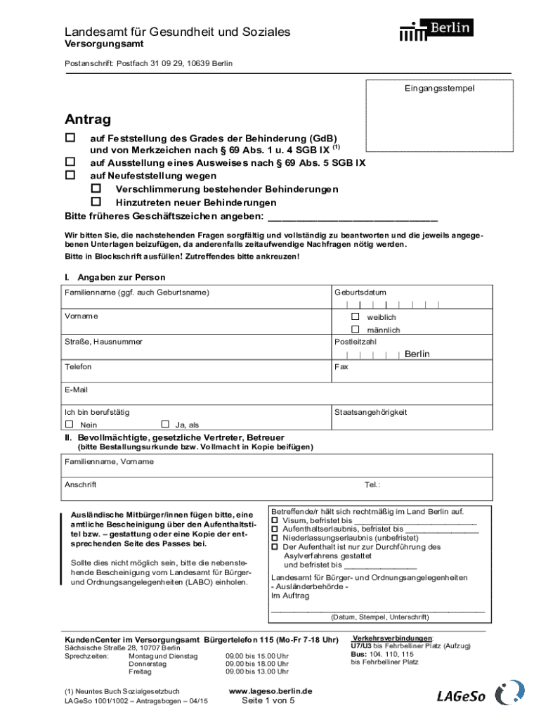 VersorgungsamtPostanschrift: Postal 31 09 29, 10639 BerlinEingangsstempelAntrag