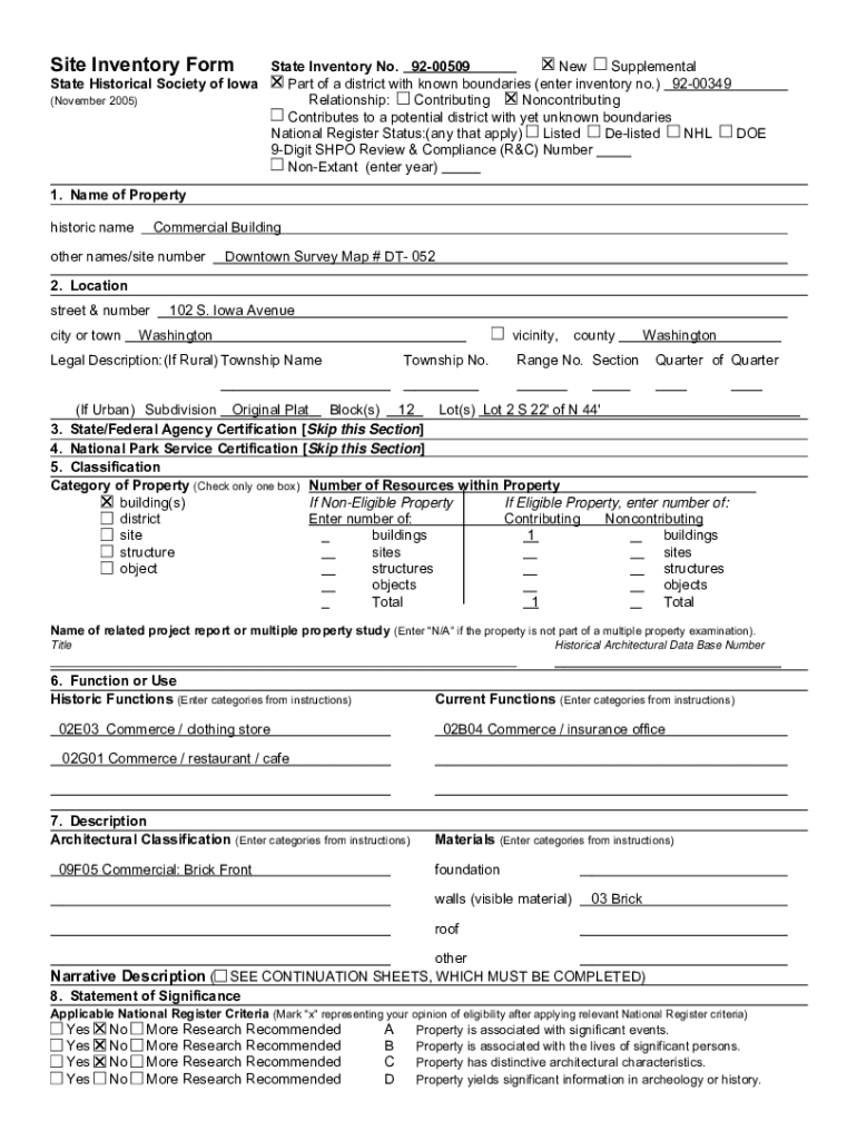 Site Inventory Form State Historical Society of Iowa (November 2005)State Inventory No. 9200509 New Supplemental Part of a district with known boundaries (enter inventory no.) 9200349 Relationship: