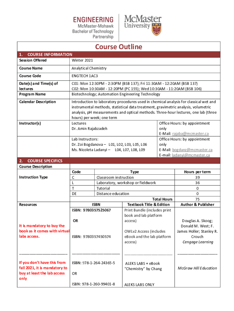 1.COURSE INFORMATIONSession OfferedWinter 2021Course NameAnalytical ChemistryCourse CodeENGTECH 1AC3Date(s) and Time(s) of