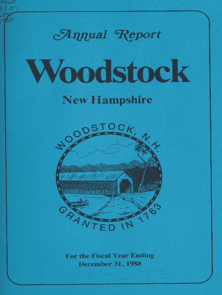 cAnnual Reportoodstock New HampshireFor the Fiscal Year Ending December 31, 1988Lae fey KisTIP a.;ih ANNUAL REPORT OF THE OFFICES FOR THEJoun of Woodstock, MN. fit iiaYEAR ENDINGDecember 31, 1988