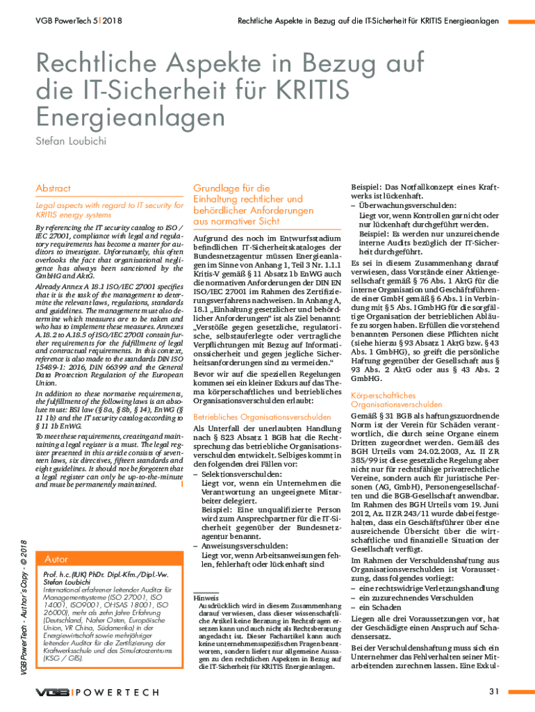 GB PowerTech5l2018Rechtliche Aspects in Being AUF die ITSicherheit for KR ITIS EnergieanlagenRechtliche Aspects in Being AUF die ITSicherheit for KR ITIS Energieanlagen Stefan LoubichiAbstract Legal