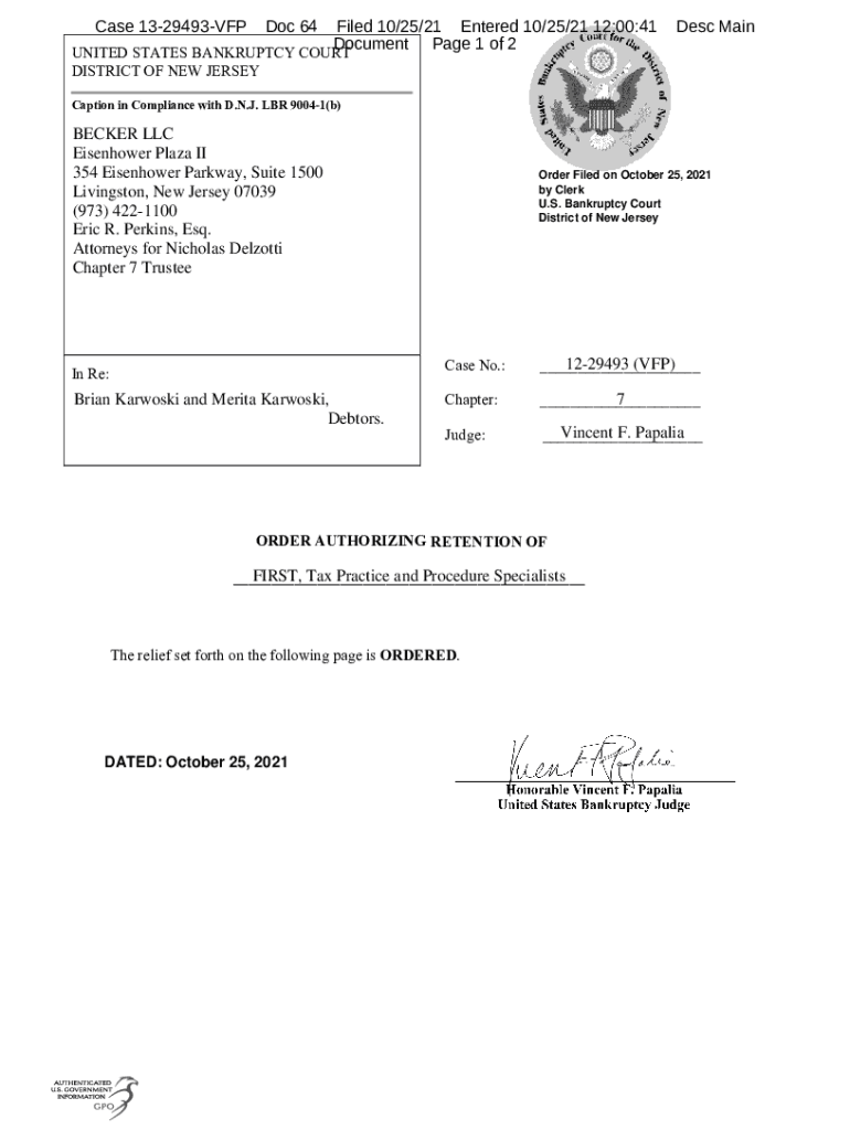 Case 1329493VFPDoc 64Filed 10/25/21 Entered 10/25/21 12:00:41 Document Page 1 of 2Desc MainUNITED STATES BANKRUPTCY COURT DISTRICT OF NEW JERSEY Caption in Compliance with D.N.J. LBR 90041(b)BECKER