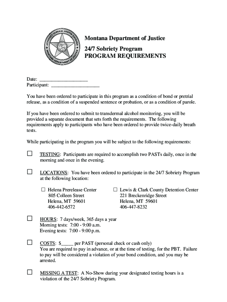 Montana Department of Justice 24/7 Sobriety Program REQUIREMENTSDate: ___ Participant: ___ You have been ordered to participate in this program as a condition of bond or pretrial release, as a condition
