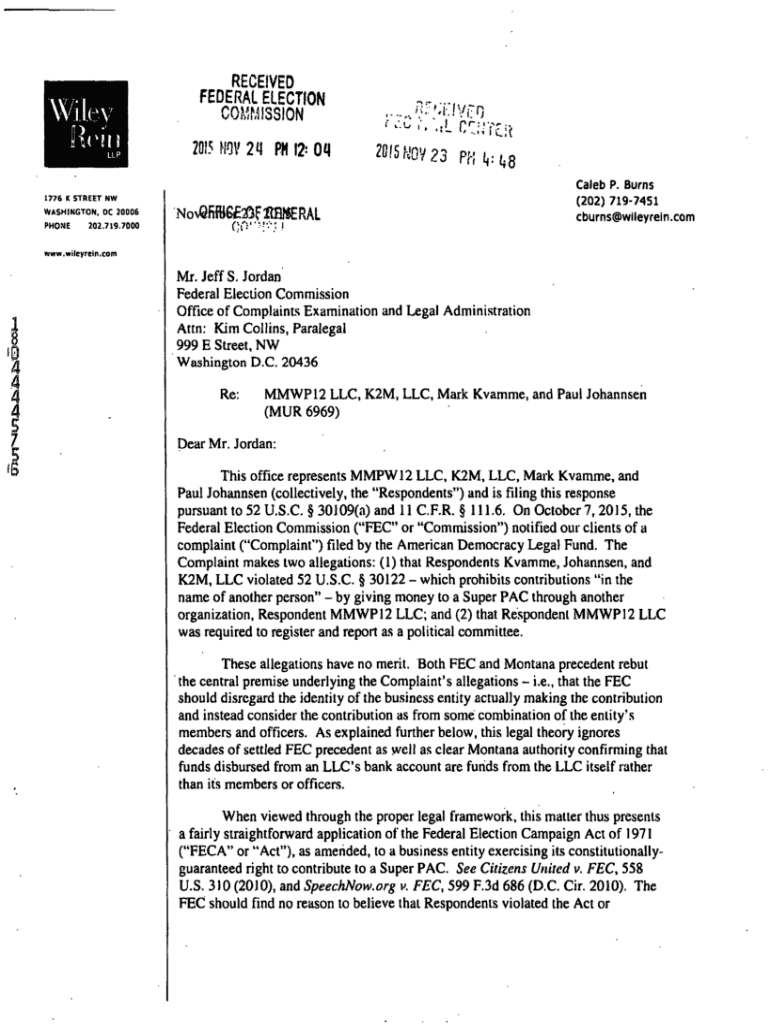 RECEIVED FEDERAL ELECTIONC0Mrl3SI0N20!5HOV2q PH 12 Of.iL2B!5NQy?3 PM i, .1776 K STREET NW WASHINGTON, DC 20006 PHONE202.719.7000No^Qfiffle20F^lBf^ERALCaleb P. Burns (202) 7197451 cburns@wlleyrein.comwww.wiieyreln.comMr.
