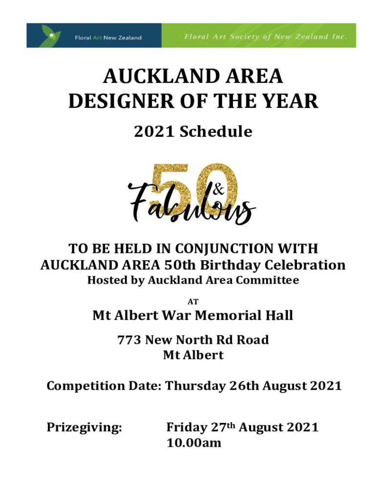 AUCKLAND REDESIGNED OF THE YEAR2021 Schedule TO BE HELD IN CONJUNCTION WITHAUCKLAND AREA 50th Birthday CelebrationHosted by Auckland Area CommitteeATMt Albert War Memorial Hall773 New North Rd Road