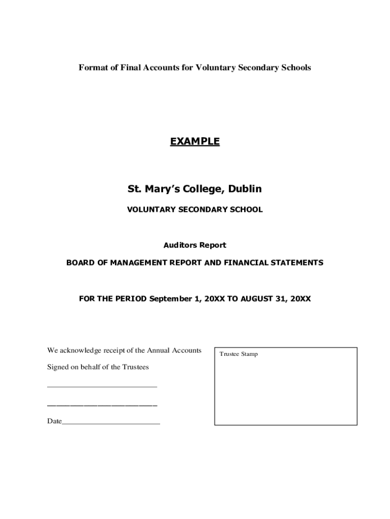 Format of Final Accounts for Voluntary Secondary SchoolsEXAMPLESt. Mary's College, Dublin VOLUNTARY SECONDARY SCHOOLAuditors Report BOARD OF MANAGEMENT REPORT AND FINANCIAL STATEMENTS THE PERIOD September