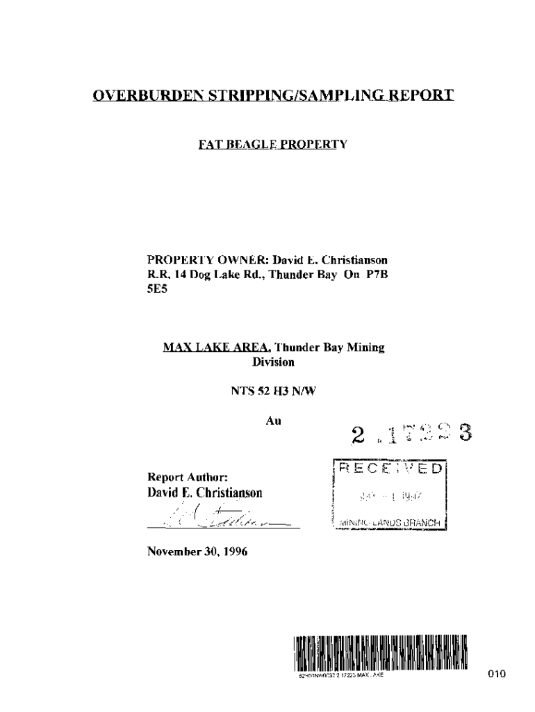 OVERBURDEN STRIPPTNG/SAMPLTNG REPORTFAT BEAGLE PROPERTYPROPERTY OWNER: David E. Christiansen R.R. 14 Dog Lake Rd., Thunder Bay On P7B 5E5MAX LAKE AREA, Thunder Bay Mining Division NTS 52 H3 N/W Au2
