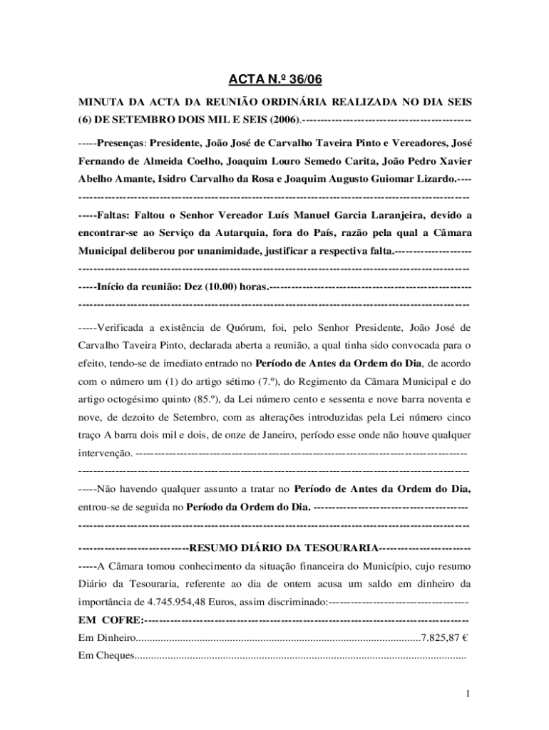 ACTA N. 36/06 MINUTE DA ACTA DA REUNION ORD INRIA REALIZED NO DID SEES (6) DE SEPTEMBER DOES MIL E SEES (2006). Presenas: President, Jew Jo's de Carvalho Tamara Pinto e Paradoxes, Jo's Fernando de