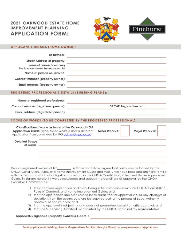 2021 LAKEWOOD ESTATE HOME IMPROVEMENT PLANNINGAPPLICATION FORM: AP P L IC A NT S D ET A IL S (HO ME O W NE R) : ERF number: Street Address of property: Name of person / company the invoice should