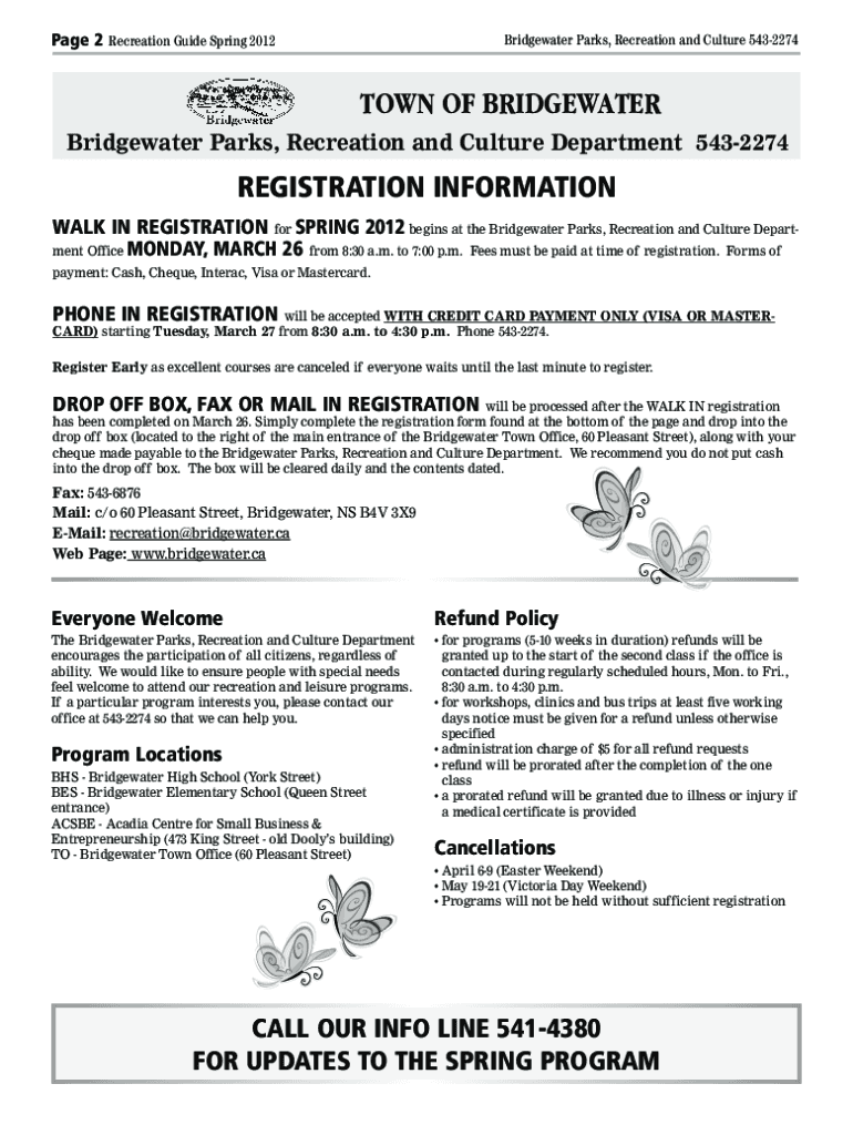 Page 2 Recreation Guide Spring 2012Bridgewater Parks, Recreation and Culture 5432274TOWN OF BRIDGEWATER Parks, Recreation and Culture Department 5432274REGISTRATION INFORMATION WALK IN REGISTRATION