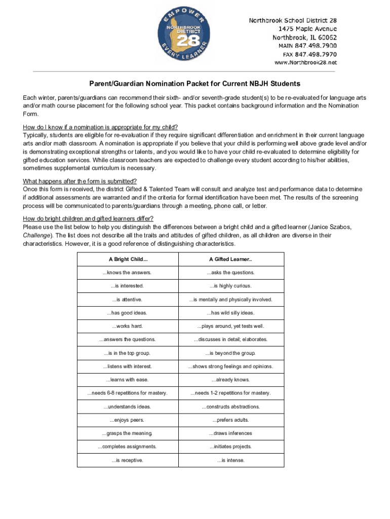 Parents, guardians, or educators of students identified as gifted or potentially gifted are required to file the nbjh gifted nomination form.