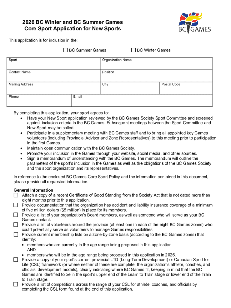 2026 BC Winter and BC Summer Games Core Sport Application for New Sports The BC Games Society supports the Canadian Sport for Life framework. The BC Games competition has been identified by the provincial