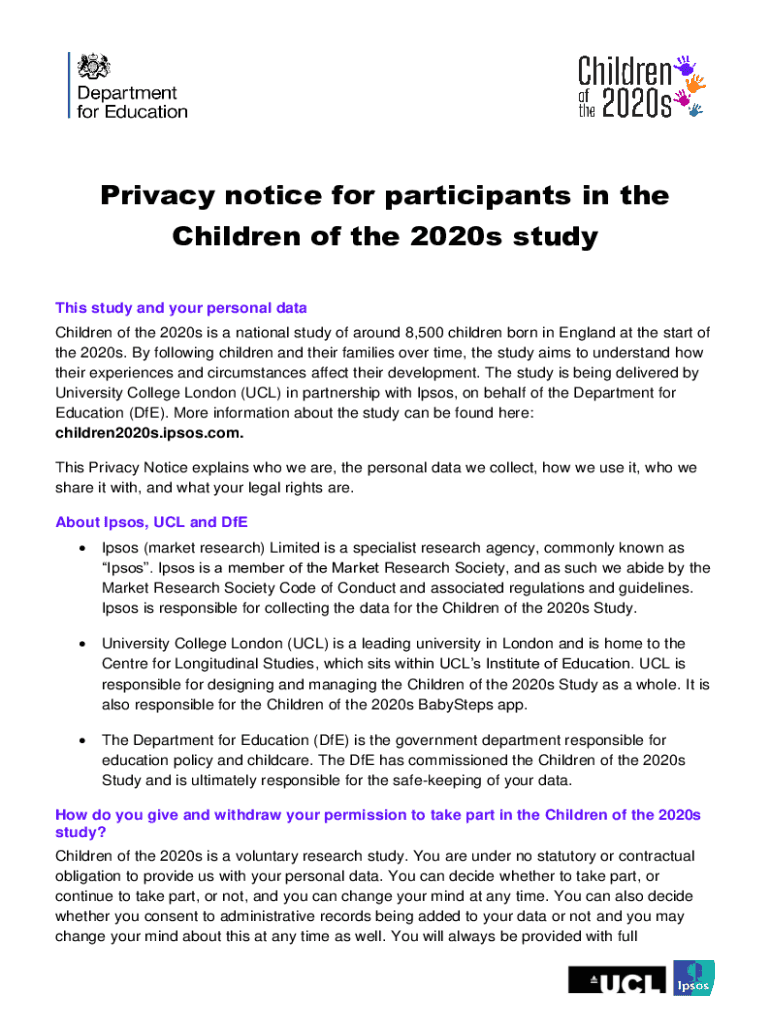 Privacy notice for participants in the Children of the 2020s study This study and your personal data Children of the 2020s is a national study of around 8,500 children born in England at the start