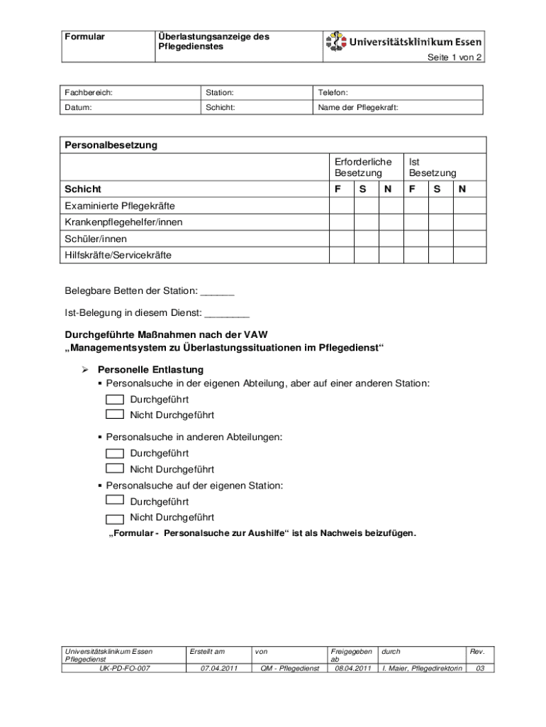Sate 1 on 2Fachbereich:Station:Telephone:Datum:Schist:Name her Pflegekraft:PersonalbesetzungSchichtErforderliche