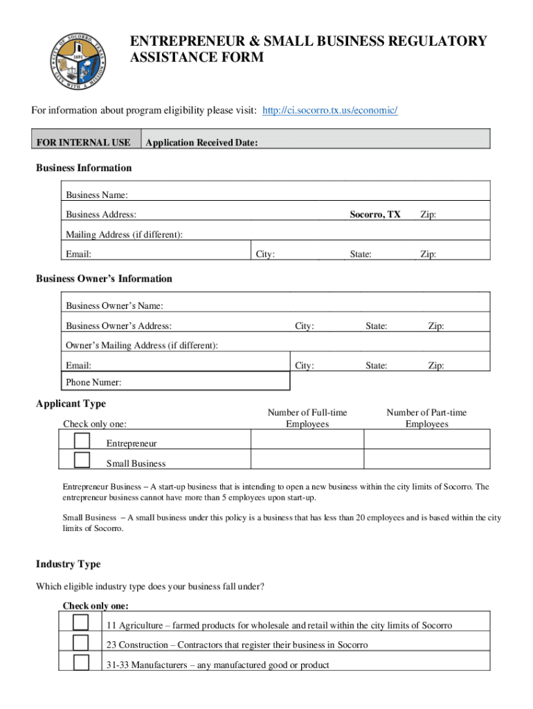 ENTREPRENEUR & SMALL BUSINESS REGULATORY ASSISTANCE Former information about program eligibility please visit: http://ci.socorro.tx.us/economic/ FOR INTERNAL Reapplication Received Date:Business Information
