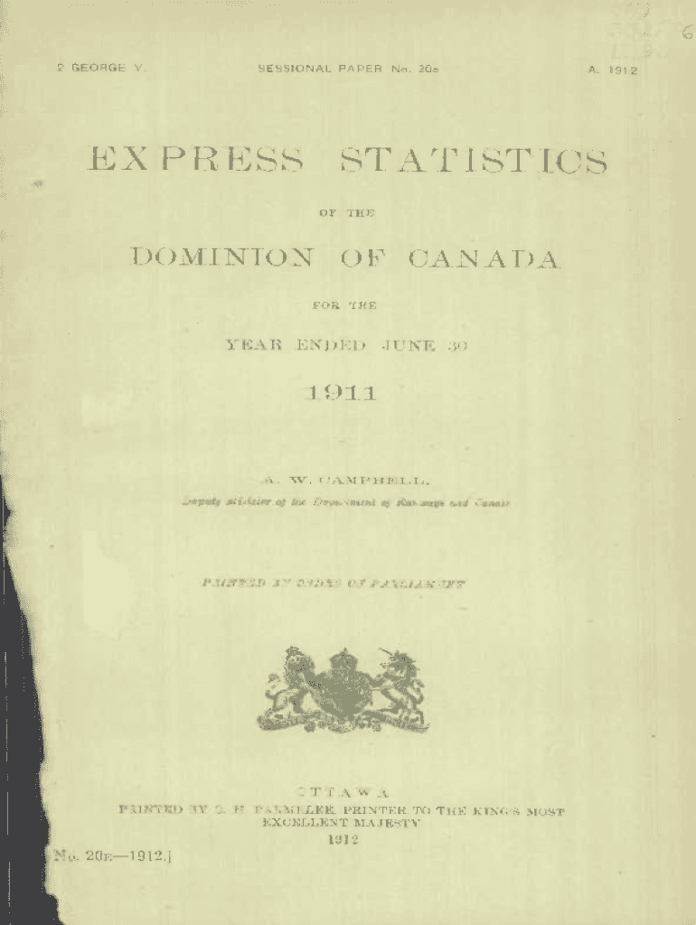 2 GEORGE V.SESSIONAL PAPER No. 20eA. 1912EXPRESS Statistics OF DOMINION OF CANAL)A FOR THEREAT END)E.1) JUNE 301911W. (AMPHORA.i, \' FLEE, PRINTER TO THE KINGS MOST EXCELLENT MAJESTY 191220i.1912.1)LC