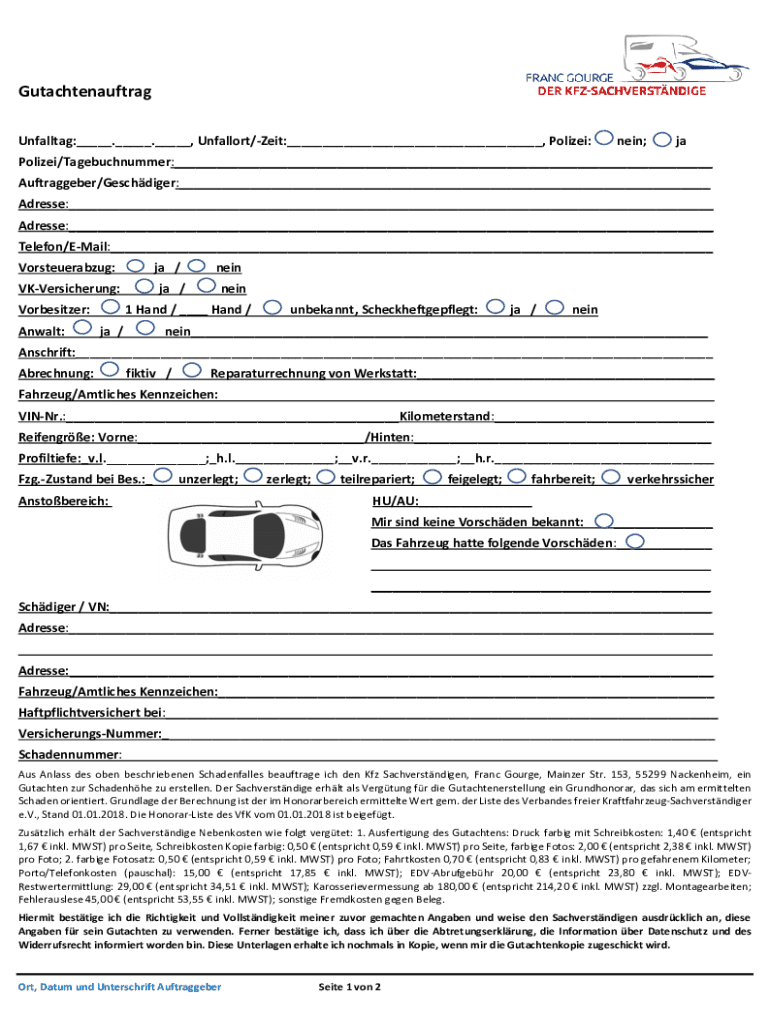 Gutachtenauftrag Unfailing:___.___.___, Fallout/Wait:___, Police:Nan;Carolina/Tagebuchnummer:___ Auftraggeber/Geschdiger:___ Address:___ Address:___ Telephone/Email:___ Vorsteuerabzug:JA /VKVersicherung: