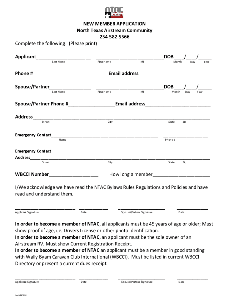 NEW MEMBER APPLICATION North Texas Air stream Community 2545825566 Complete the following: (Please print) Applicant___ Last Name___DOB___/___/___ First NameMIMonthDayYearPhone #___Email address___