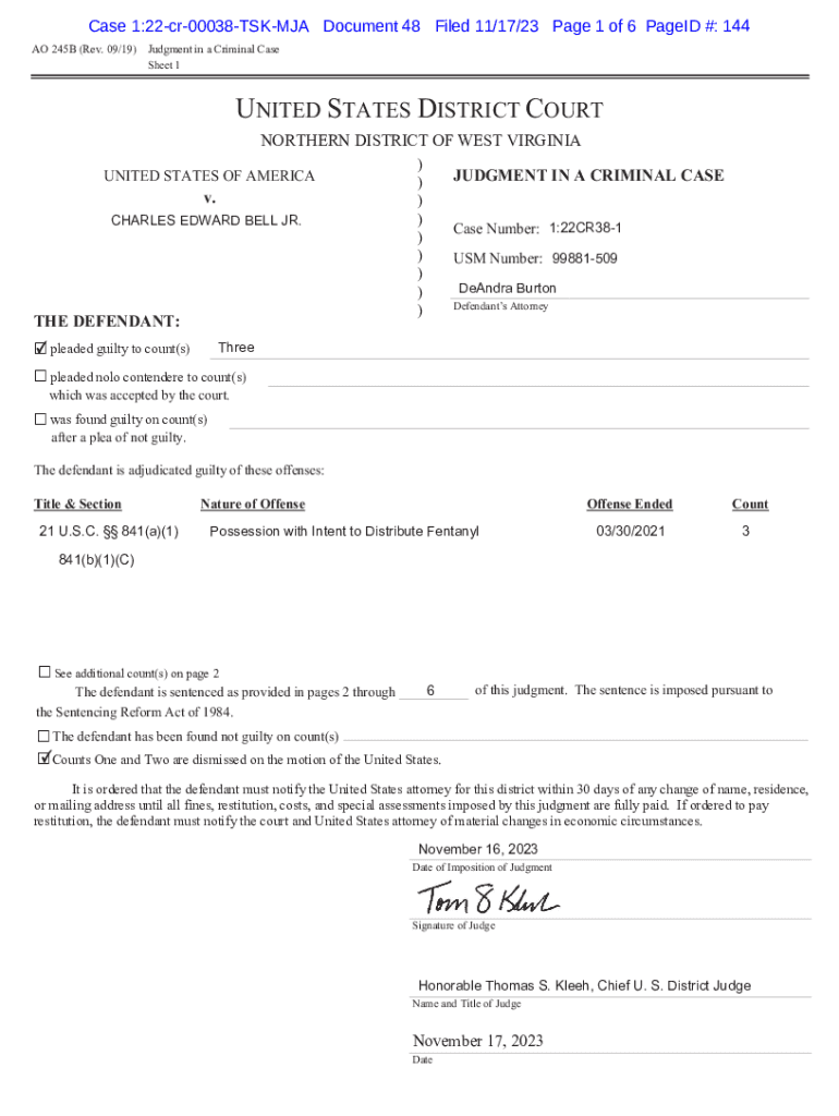 Case 1:22cr00038TSKMJA Document 48 Filed 11/17/23-Page 1 of 6 Paged #: 144 AO 09/19) Judgment in AA Criminal Criminal Case Case AO 245B (Rev. (Rev. 11/16) Judgment in Sheet 1UNITED STATES DISTRICT
