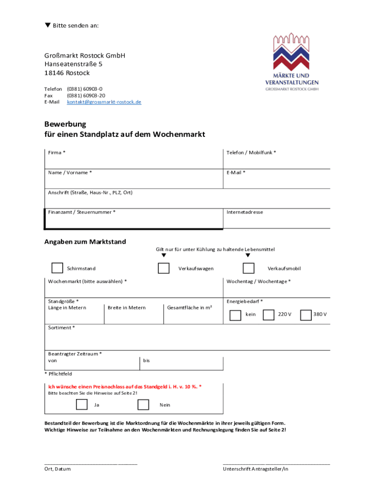 Bitter sender an:Remarks Rostock GmbH Hanseatenstrae 5 18146 Rostock Telephone (0381) 609030 Fax (0381) 6090320 Email kontakt@grossmarktrostock.deBewerbung for linen Standplatz AUF them Wochenmarkt