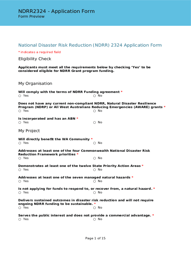 NDRR2324 Application Form PreviewNational Disaster Risk Reduction (NDLR) 2324 Application Form * indicates a required eligibility Check Applicants must meet all the requirements below by checking