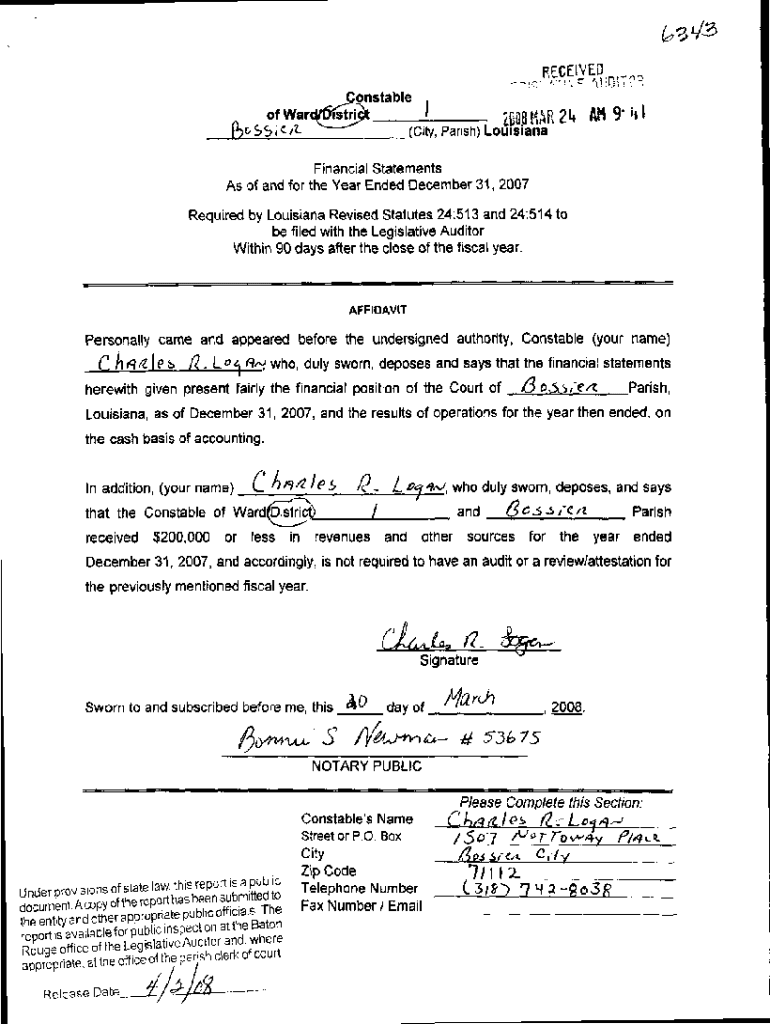 2U AM 9\' (City, Parish) Louisiana Financial Statements As of and for the Year Ended December 31, 2007, Required by Louisiana Revised Statutes 24:513 and 24:514 to be filed with the Legislative Auditor