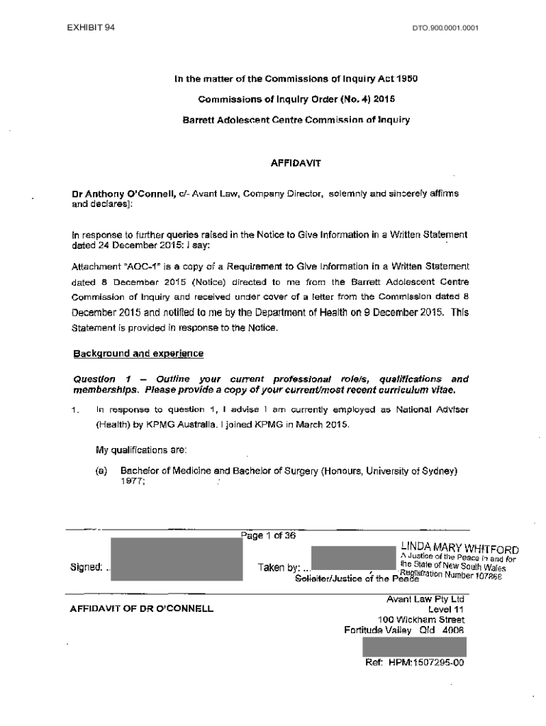 EXHIBIT 94DTO.900.0001.0001In the matter of the Commissions of Inquiry Act 1950 Commissions of Inquiry Order (No. 4) 2015 Barrett Adolescent Center Commission of InquiryAFFIDAVITDr Anthony O\'Connell,