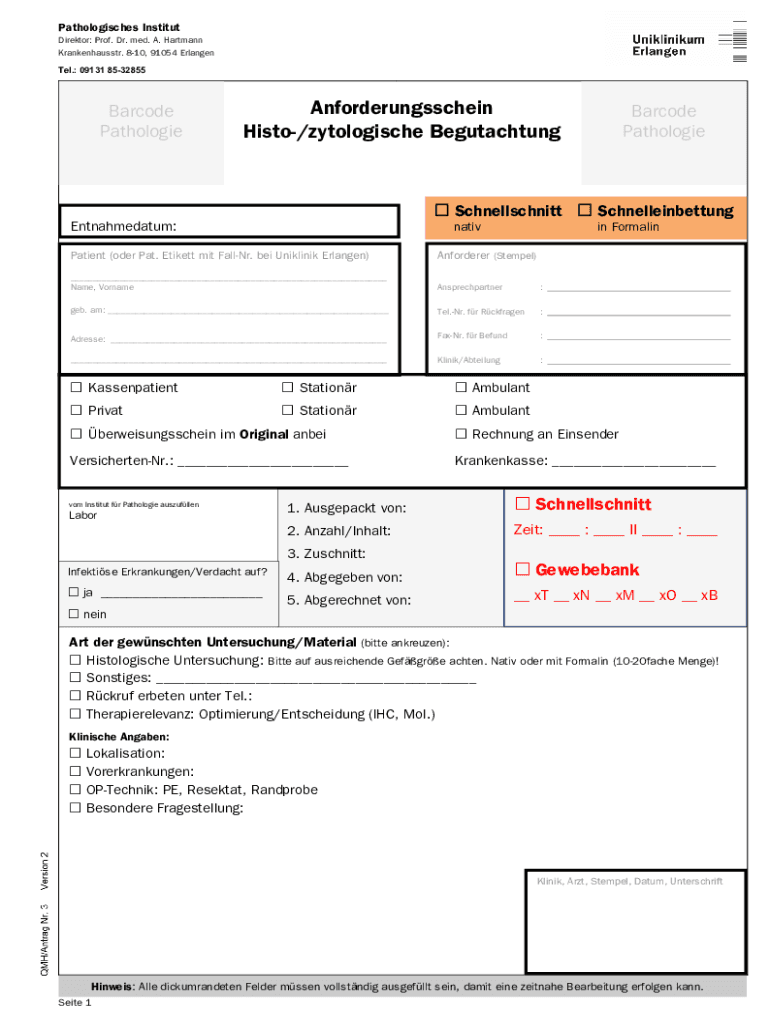 Pathologists Institute Director: Prof. Dr. med. A. Hartmann Krankenhausstr. 810, 91054 Erlangen Tel.: 09131 8532855Barcode PathologieAnforderungsschein Hist/zytologische BegutachtungBarcode Pathologic