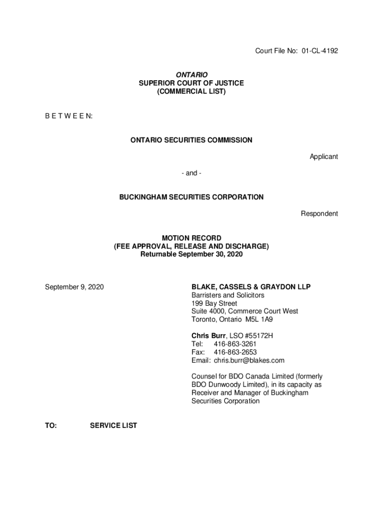 Court File No: 01CL4192ONTARIO SUPERIOR COURT OF JUSTICE (COMMERCIAL LIST)B E T W E E N:ONTARIO SECURITIES COMMISSION Applicant and BUCKINGHAM SECURITIES CORPORATION RespondentMOTION RECORD (FEE APPROVAL,