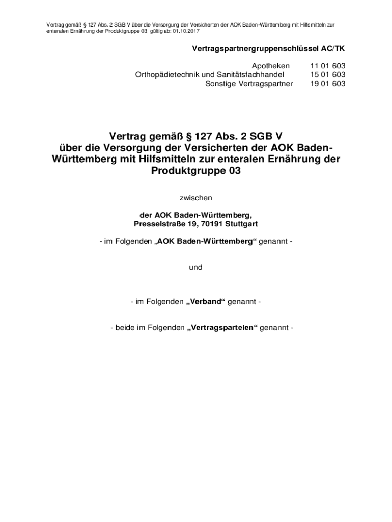 Vert rag gem 127 Abs. 2 SGB V BER die Overstrung her Versicherten her AOK Baden-Wurttemberg MIT Hilfsmitteln our enteralen Erring her Produktgruppe 03, gig ab: 01.10.2017Vertragspartnergruppenschlssel