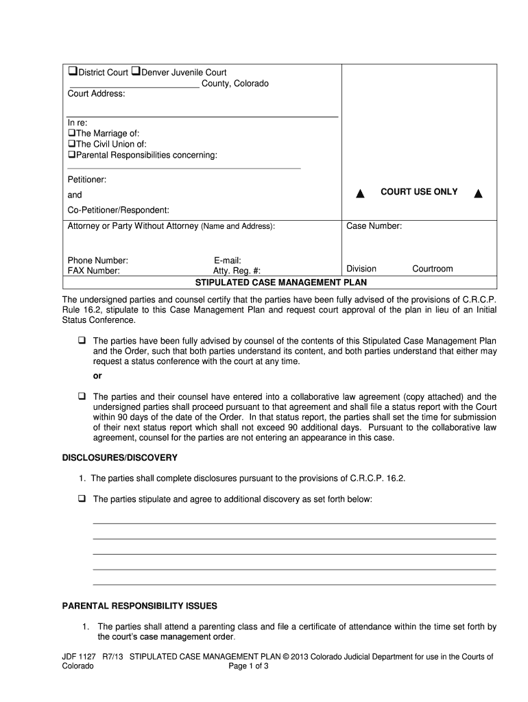District Court Denver Juvenile Court County, Colorado Court Address: In re: The Marriage of: The Civil Union of: Parental Responsibilities concerning: Petitioner: COURT USE ONLY and Co-Petitioner/Respondent: