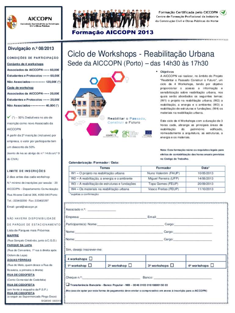 Divulge n. 08/2013 CANDIES DE PARTICIPATE Conj unto DE 4 workshopsCiclo de Workshops Rehabilitate Urbana See the ACCOUNT (Porto) was 14h30 s 17h30Associados the ACCOUNT 60,00ObjetivosEstudantes e