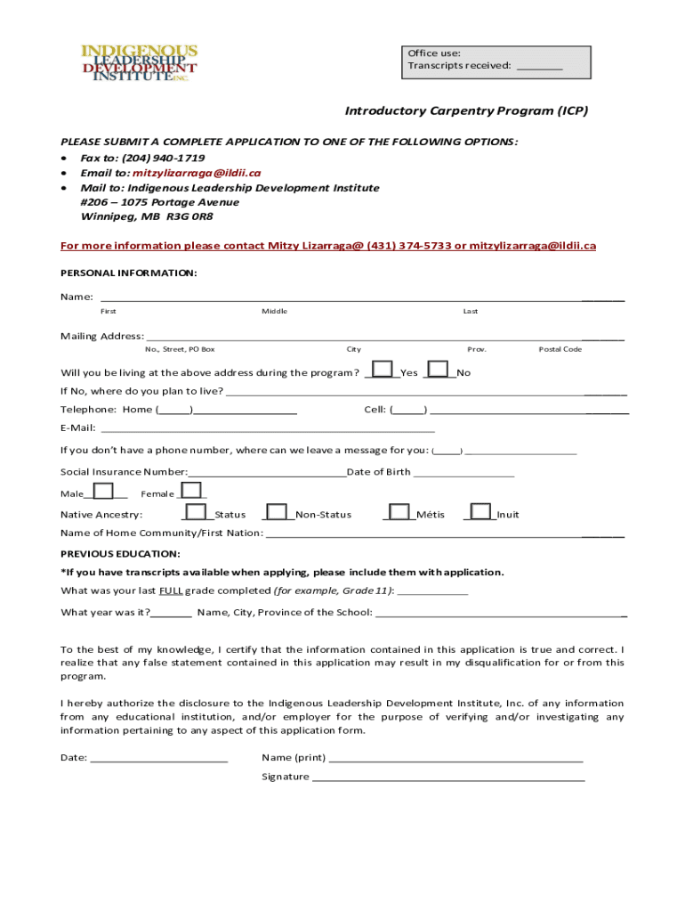 Office use: Transcripts received:Introductory Carpentry Program (ICP) PLEASE SUBMIT A COMPLETE APPLICATION TO ONE OF THE FOLLOWING OPTIONS: Fax to: (204) 9401719 Email to: mitzylizarraga@ildii.ca