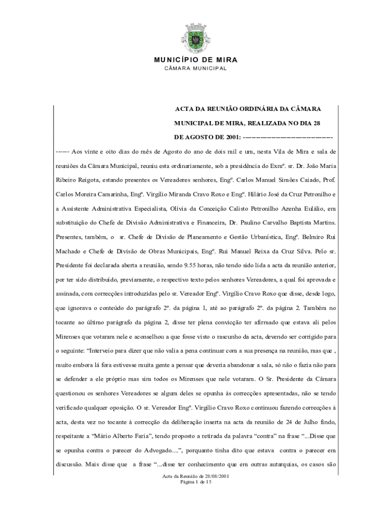 Acta da reuni343ode 28-08-01doc is typically needed by individuals or organizations who want to officially document the proceedings and outcomes of a meeting. This document serves as a record of what was discussed, decisions made, and actions taken during the meeting. It may be required by supervisors, managers, or stakeholders to review and refer back to the meeting details. Additionally, it can also be used as supporting evidence or documentation for legal or compliance purposes.