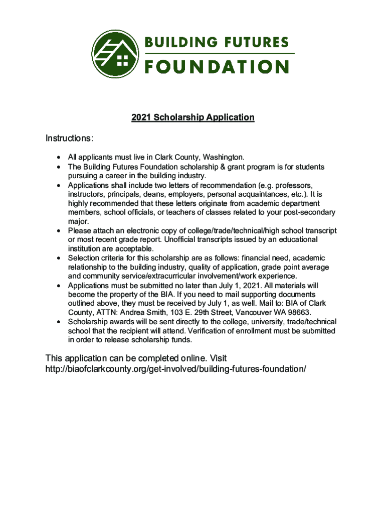 2021 Scholarship Application Instructions: All applicants must live in Clark County, Washington. The Building Futures Foundation scholarship & grant program is for students pursuing a career in the