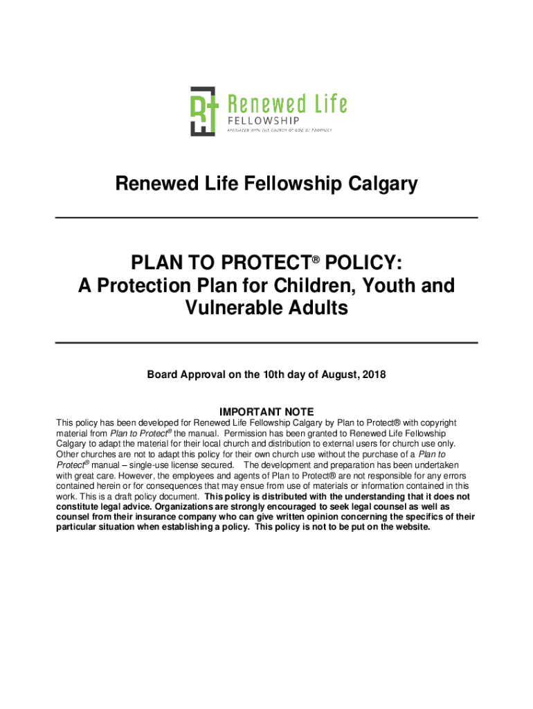 Renewed Life Fellowship CalgaryPLAN TO PROTECT POLICY: A Protection Plan for Children, Youth and Vulnerable AdultsBoard Approval on the 10th day of August, 2018IMPORTANT NOTE This policy has been
