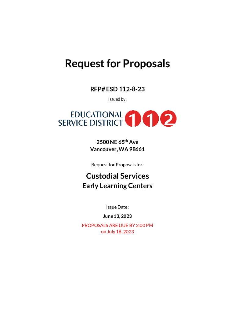 Request for Proposals RFP# ESD 112823 Issued by:2500 NE 65th Ave Vancouver, WA 98661 Request for Proposals for:Custodial Services Early Learning Centers Issue Date: June 13, 2023, PROPOSALS ARE DUE