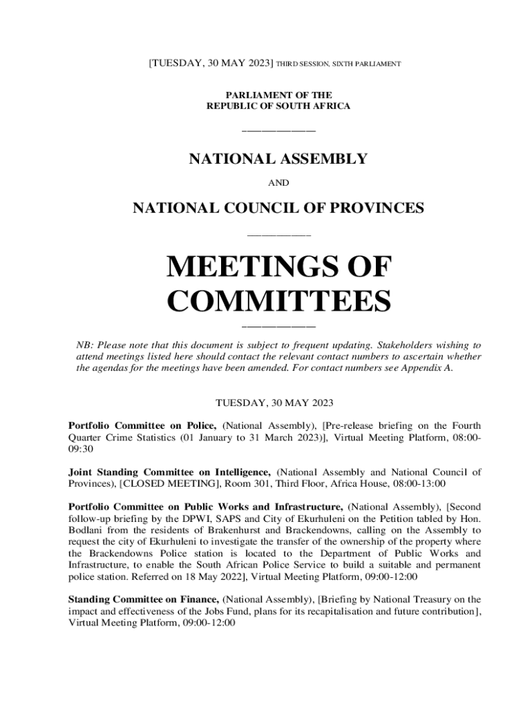 [TUESDAY, 30 MAY 2023] THIRD SESSION, SIXTH PARLIAMENT OF THE REPUBLIC OF SOUTH AFRICA ___NATIONAL ASSEMBLY NATIONAL COUNCIL OF PROVINCES ___MEETINGS OF COMMITTEES ___NB: Please note that this document