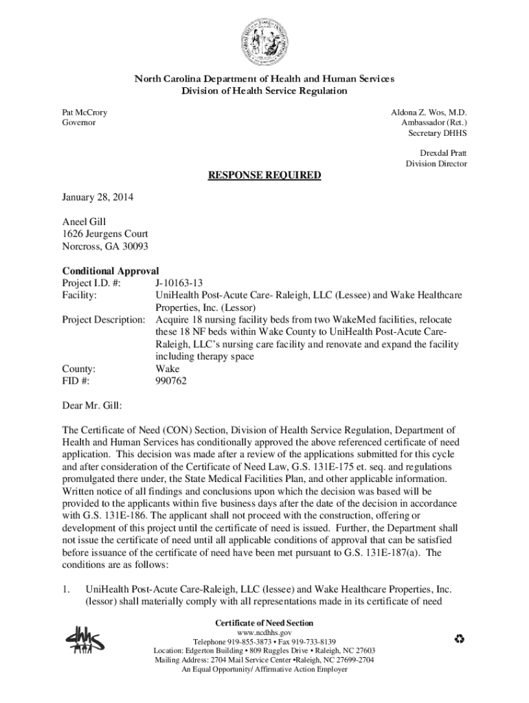 Get the free NC DHSR CON: Decision for UniHealth Post-Acute Care-Raleigh