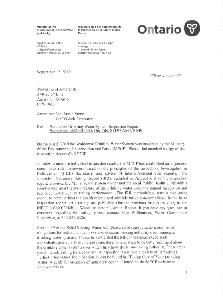 Ministry of the Environment, Conservation and ParksMinistdre de I\'Environnement, de la Protection de la nature et desGuelph District Office 4th Floor 1 Stone Road West Guelph, Ontario N 1G 4Y2Bureau