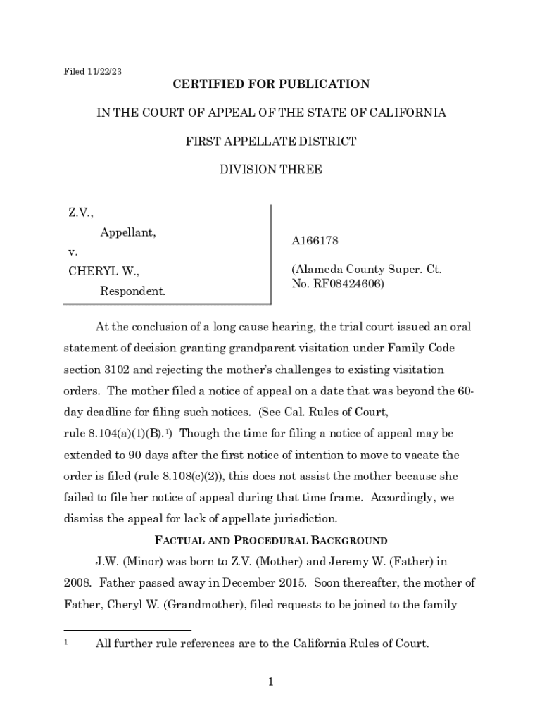 Filed 11/22/23CERTIFIED FOR PUBLICATION IN THE COURT OF APPEAL OF THE STATE OF CALIFORNIA FIRST APPELLATE DISTRICT DIVISION THREE Z.V., Appellant,A166178v.(Alameda County Super. Ct. No. RF08424606)CHERYL