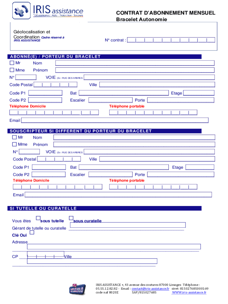 CONTRACT ATONEMENT MANUEL Bracelet Autonomic Globalization et Coordination Cadre serve N contract : ___|___|___|___|___|___|___|___|___|___IRIS ASSISTANCEABONN(E) / PORTER DU BRACELET MrNom___MmePrnom___N