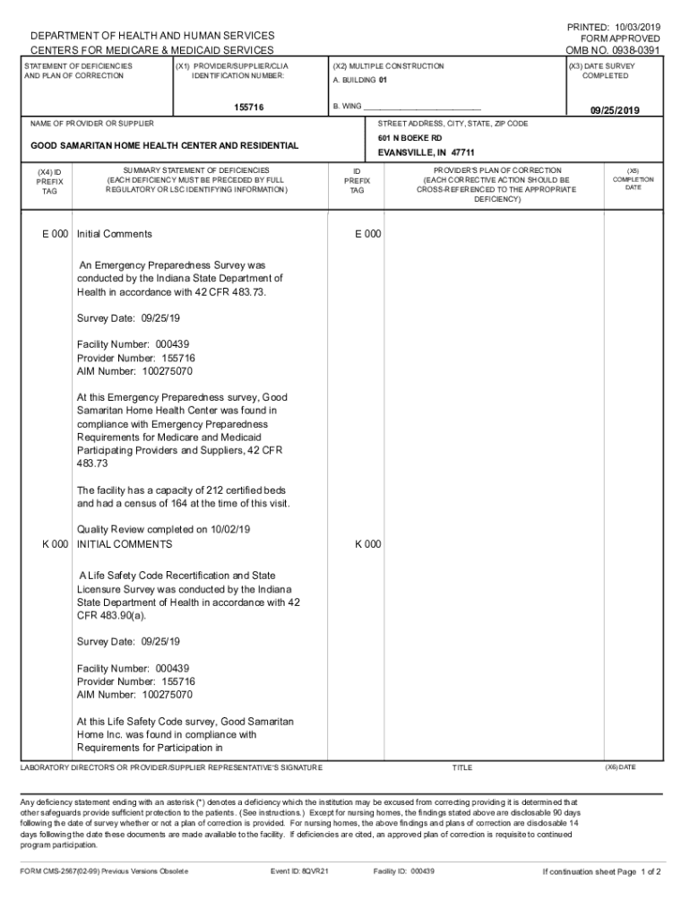 PRINTED: 10/03/2019 FORM APPROVEDDEPARTMENT OF HEALTH AND HUMAN SERVICES CENTERS FOR MEDICARE & MEDICAID SERVICES STATEMENT OF DEFICIENCIES AND PLAN OF CORRECTION(X1) PROVIDER/SUPPLIER/CIA IDENTIFICATION