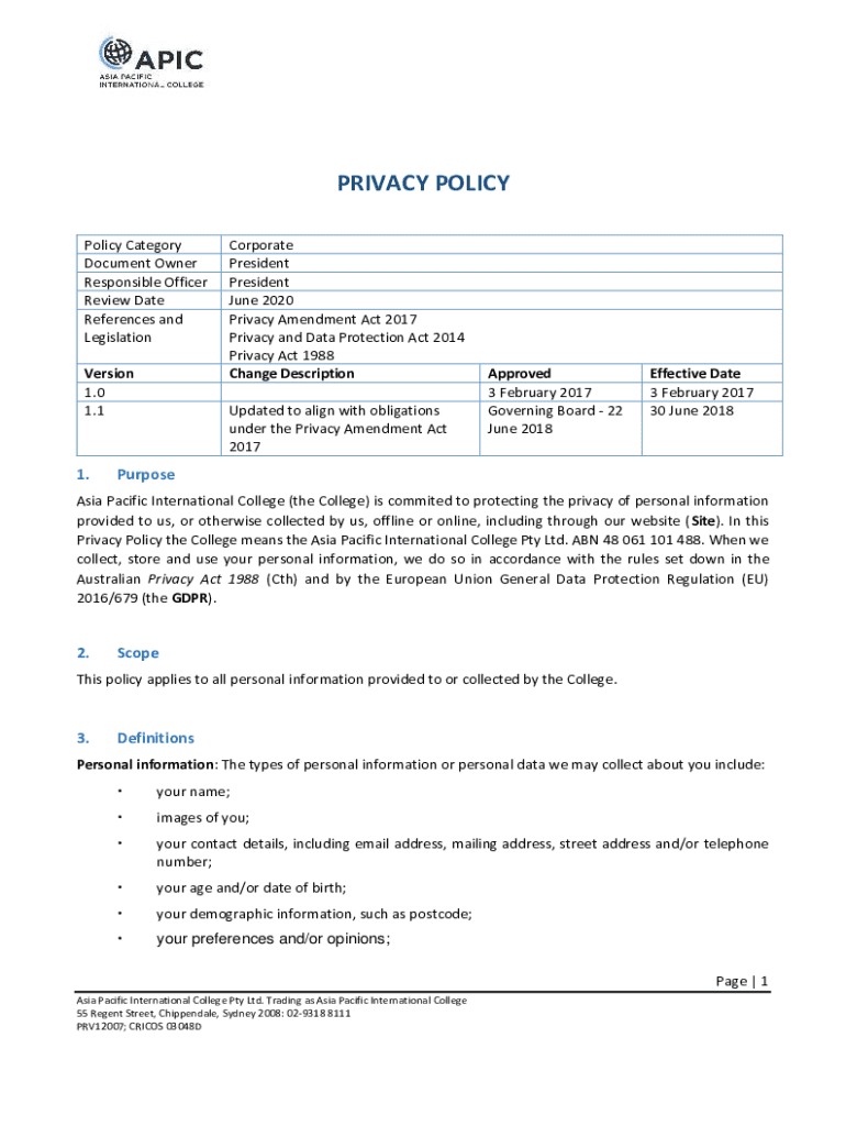 PRIVACY POLICY Category Document Owner Responsible Officer Review Date References and Legislation Version 1.0 1.11. Corporate President June 2020 Privacy Amendment Act 2017 Privacy and Data Protection