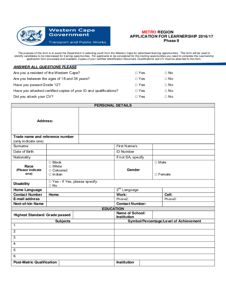 METRO REGION APPLICATION FOR LEARNERS HIP 2016/17 Phase 9 The purpose of this form is to assist the Department in selecting youth from the Western Cape for advertised learning opportunities. This