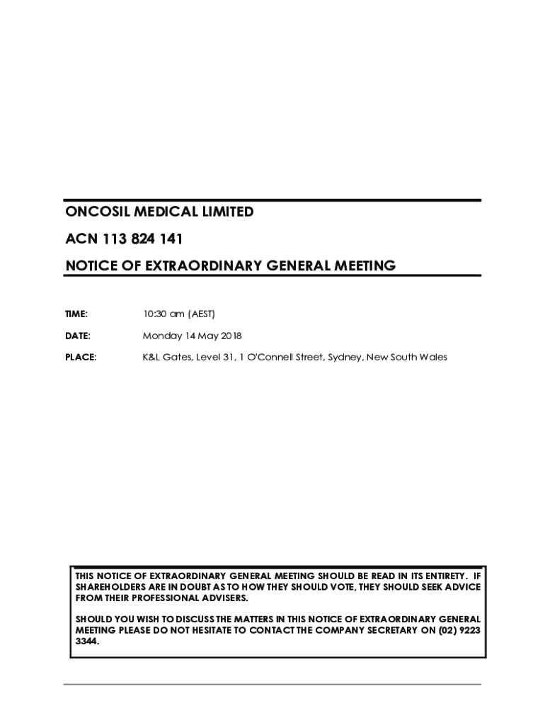 ONCOSIL MEDICAL LIMITED ACN 113 824 141 NOTICE OF EXTRAORDINARY GENERAL MEETINGTIME:10:30 am (AEST)DATE:Monday 14 May 2018PLACE:K&L Gates, Level 31, 1 O\'Connell Street, Sydney, New South WalesTHIS