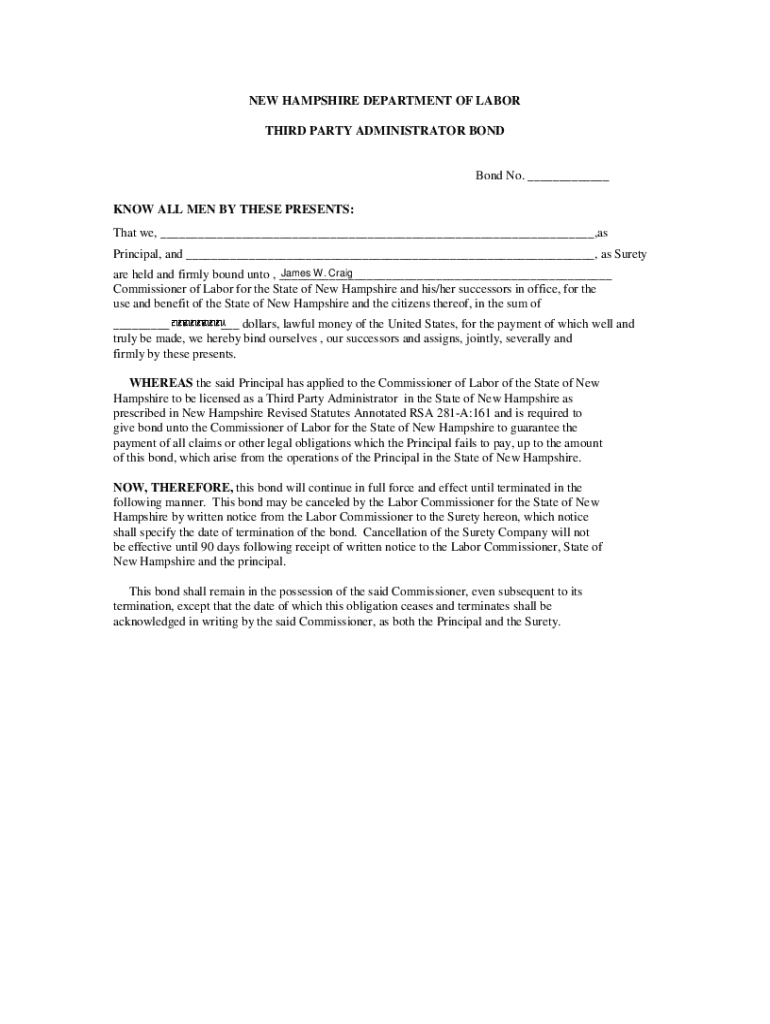 NEW HAMPSHIRE DEPARTMENT OF LABOR THIRD PARTY ADMINISTRATOR BOND Bond No. ___ KNOW ALL MEN BY THESE PRESENTS: That we, ___, as Principal, and ___, as Surety James W. Craig are held and firmly bound