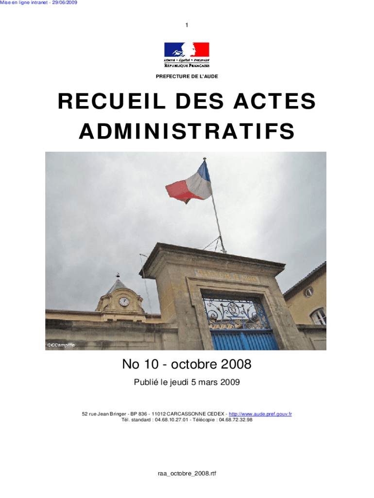 Mile en line intranet 29/06/20091PREFECTURE DE L\'AUDERECUEIL DES ACTS Administration 10 October 2008 Public LE Jedi 5 Mars 200952 rue Jean Bringer BP 836 11012 CARCASSONNE CEDEX http://www.aude.pref.gouv.fr
